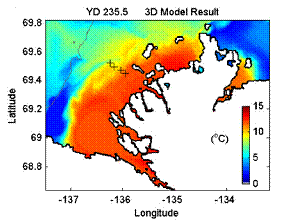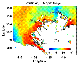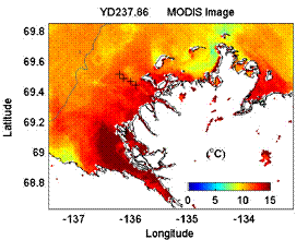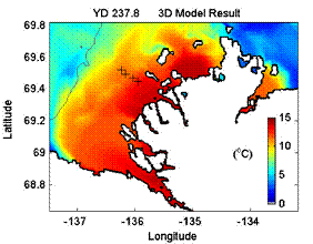 a)-b) Sea surface temperatures from MODIS satellite observations in August 2007, showing the extent of the Mackenzie River plume in the delta region. Easterly winds cause upwelling, stronger mixing and lower temperature of the plume in a); light winds with minimal mixing and entrainment of underlying shelf water allow the higher temperature plume to spread as a thin surface layer in b). c)-d) Model results for sea surface temperature at the same times as satellite data, indicating movement of the plume though the instrument array denoted by crosses.