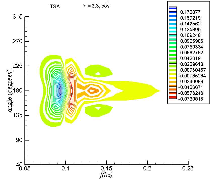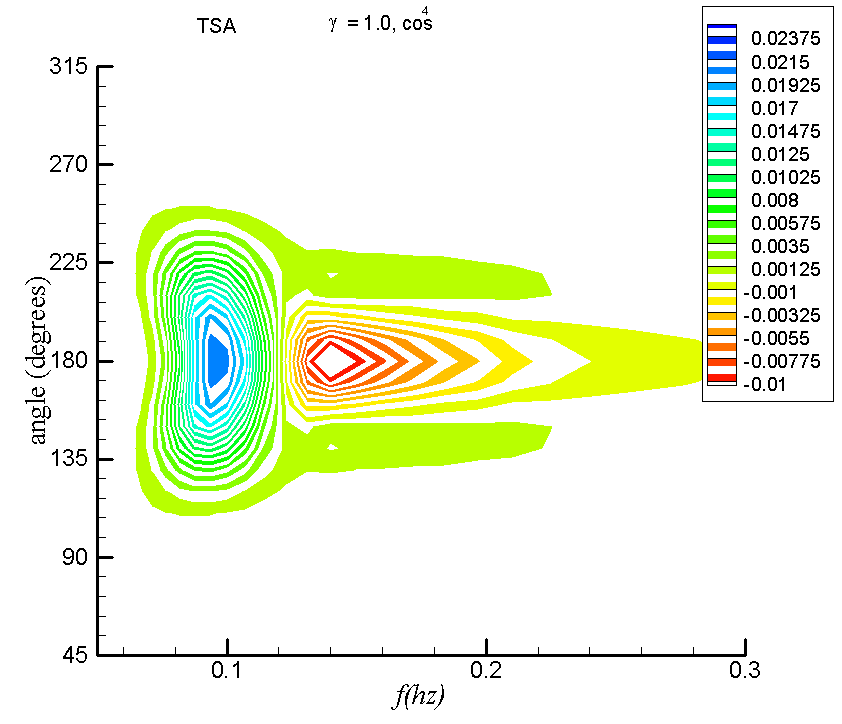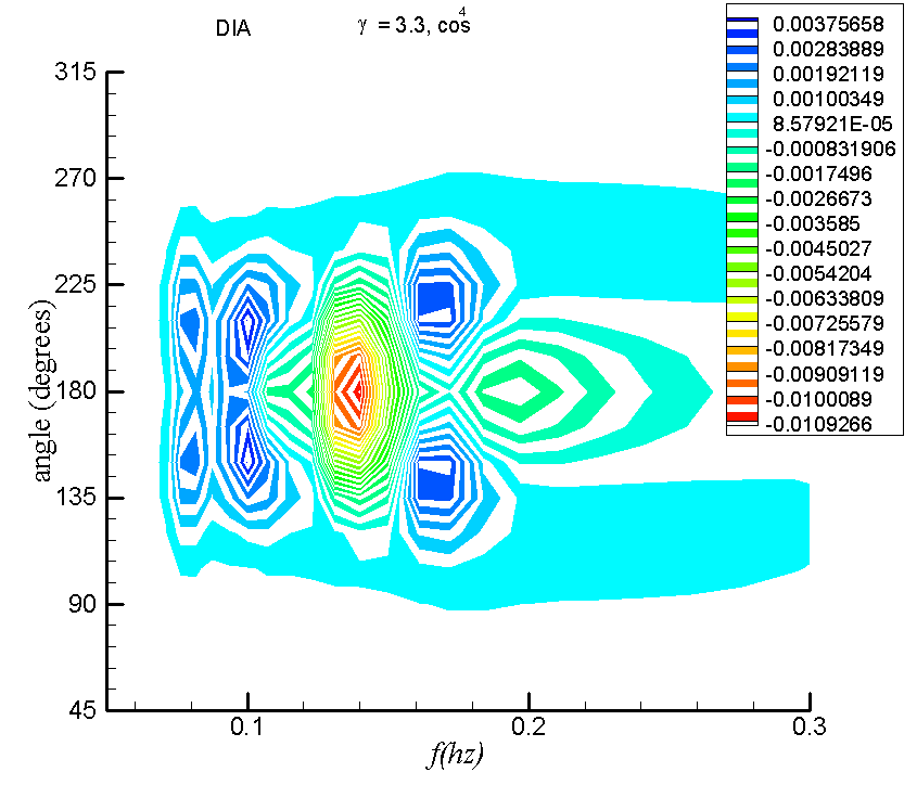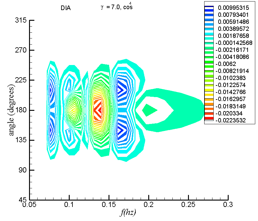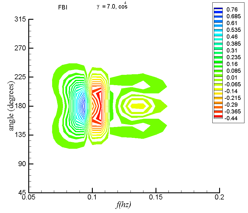 Contours of Snl(f,θ) as a function of angle θ and frequency f for (a) the full Boltzmann integral (FBI) and (b) TSA, (c) DIA, for a JONSWAP spectrum with a cos4 angular distribution centered at 180° for spectral peakedness γ= 1. Units are m2. Note that (d), (e), (f) use γ= 3.3, and (g), (h), (i) use γ= 7.0.